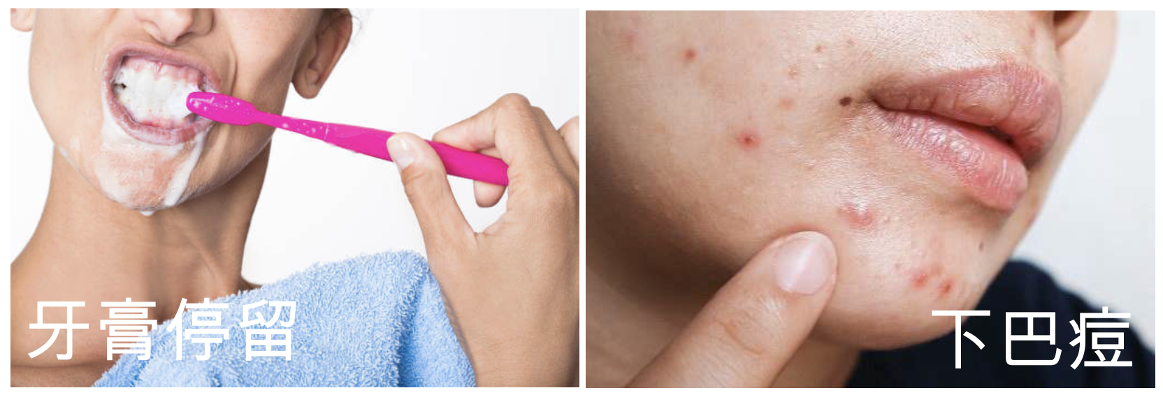 因為氟屬於鹵素,而鹵素會造成痘痘的生長,而刷牙時難免會讓牙膏接觸或停留在肌膚,尤其是下巴。