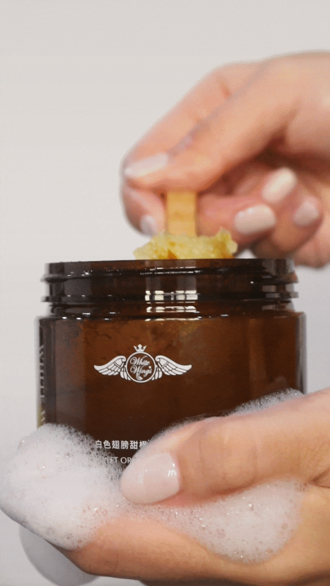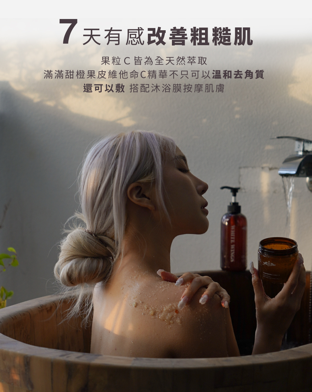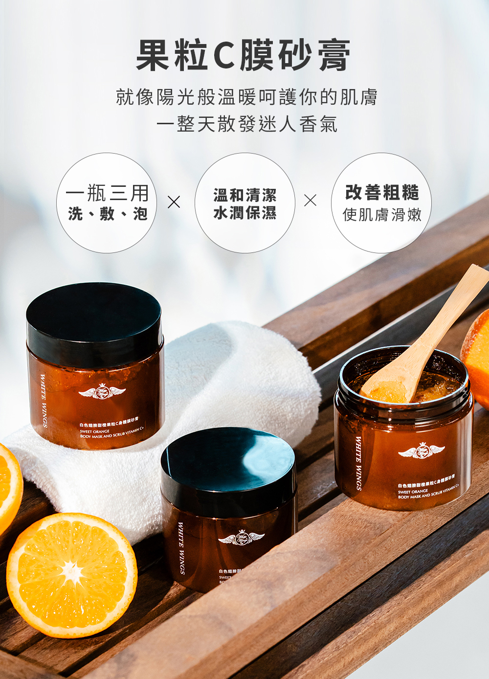 白色翅膀「果粒C身體膜砂膏」,蘊含甜橙果粒、蜜糖微粒,重現透亮純淨肌,徹底清潔髒污,淨透煥亮。