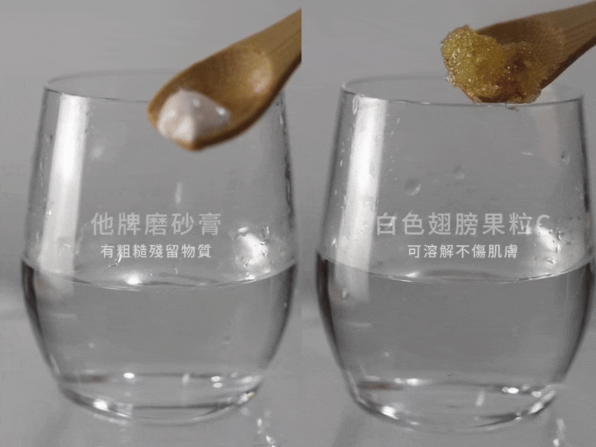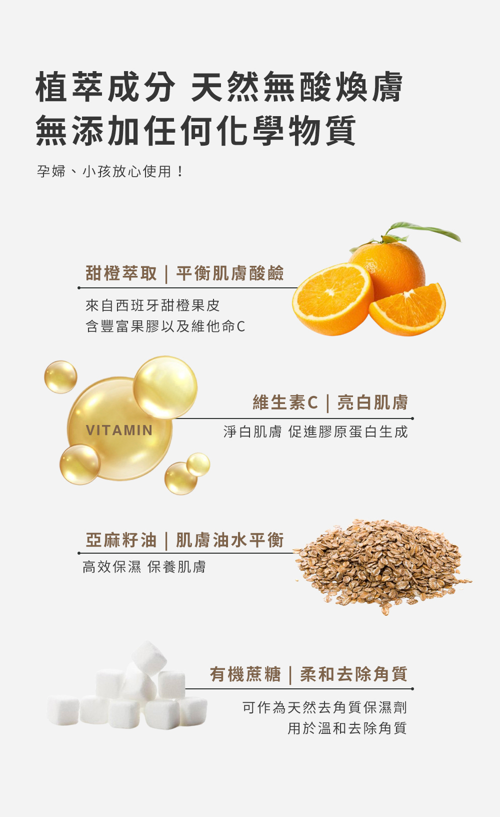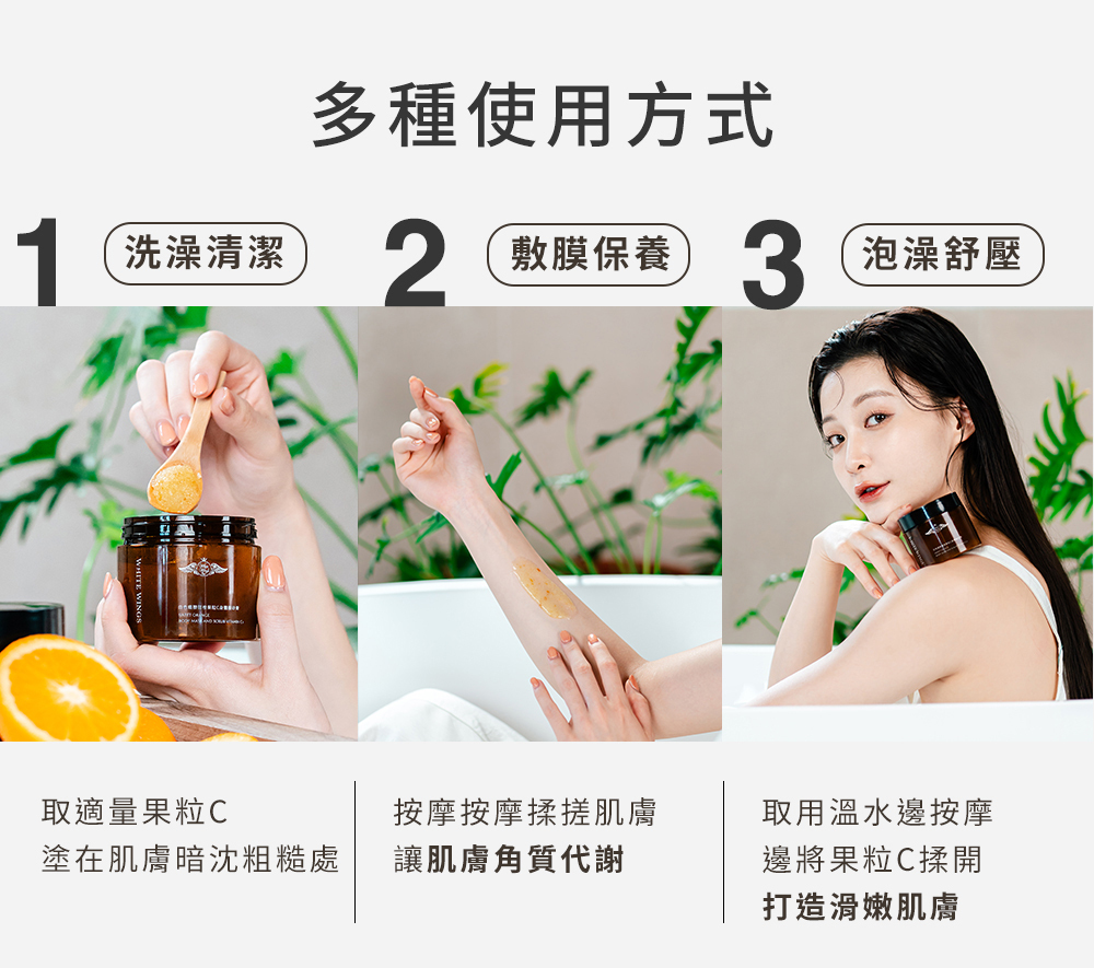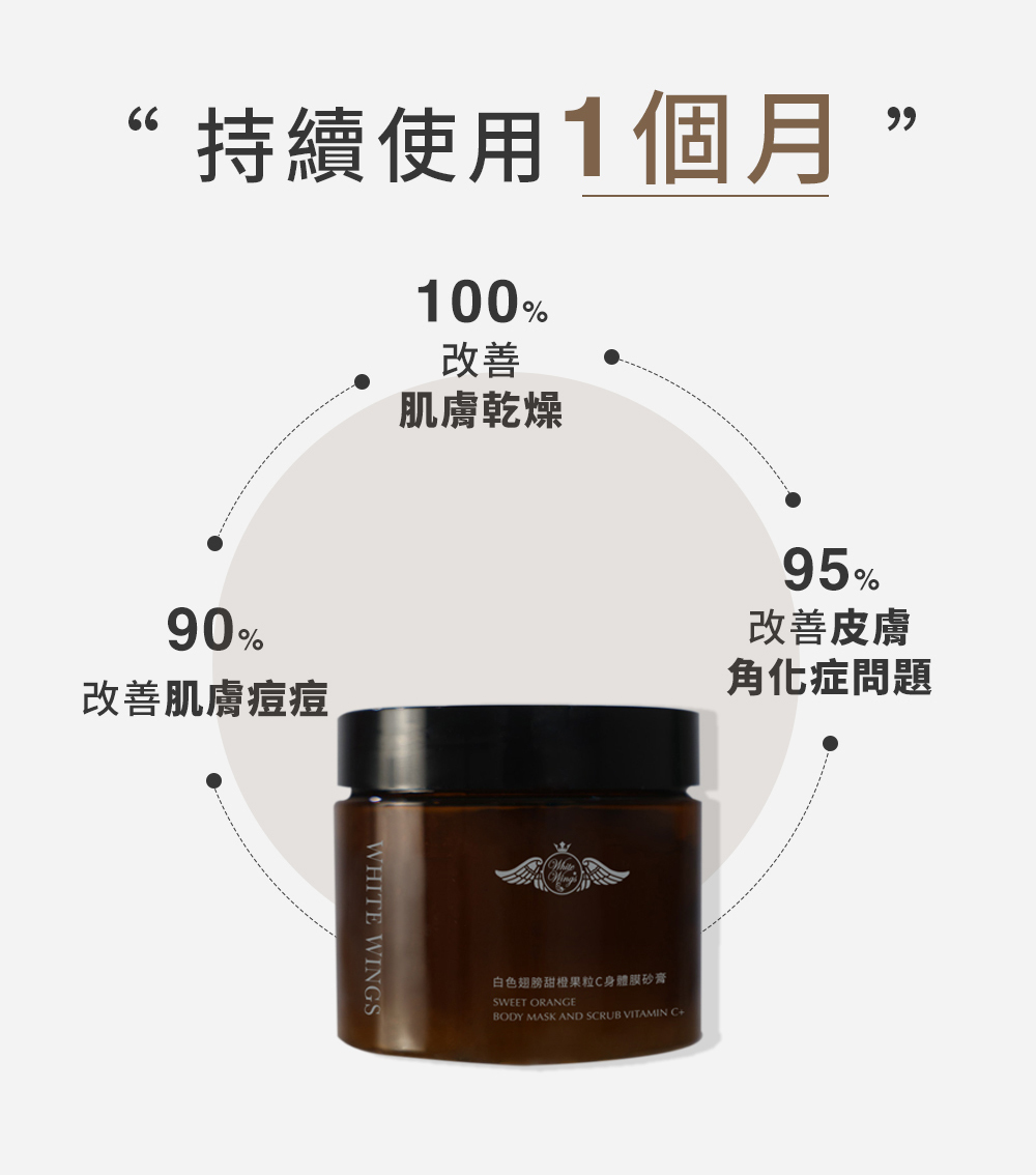 白色翅膀「果粒C身體膜砂膏」,蘊含甜橙果粒、蜜糖微粒,重現透亮純淨肌,徹底清潔髒污,淨透煥亮。