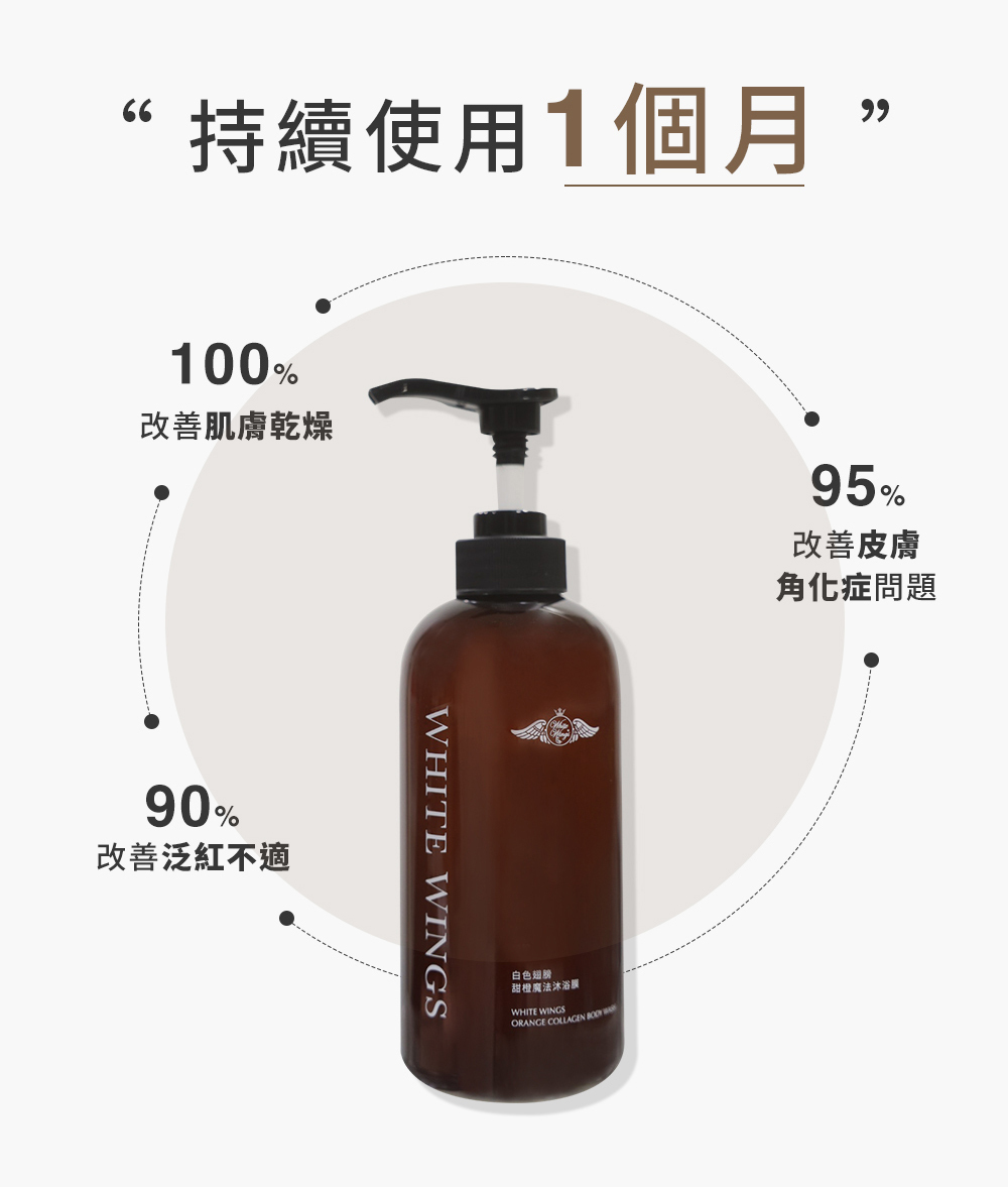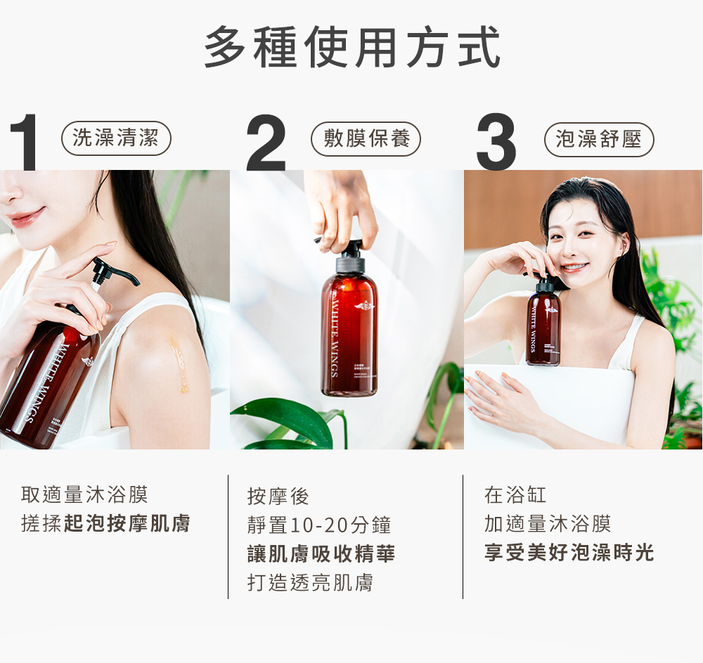 「魔法沐浴膜」搭配白色翅膀新推出的「果粒C身體膜砂膏」,能夠更有效的去肌膚角質,喚新肌膚光彩。